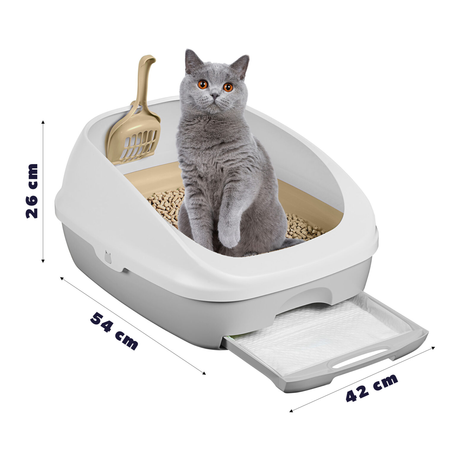 Featuring a low-profile, open design with high sides, this litter tray is remarkably versatile. It is well-suited for larger cats up to 8 kg, especially in spaces where placement is limited. It can also support households with two or three cats. Please ensure you check the dimensions carefully before purchasing.