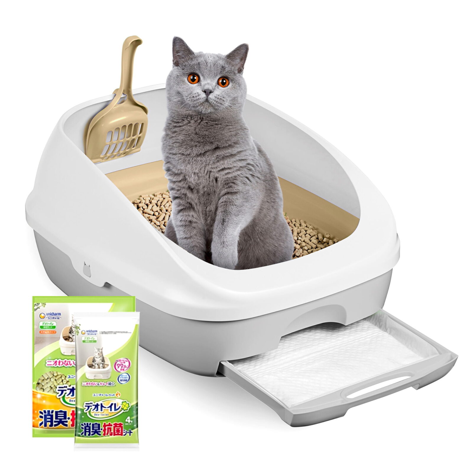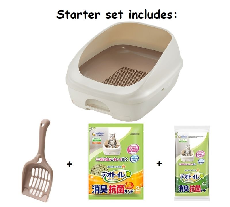 Cat Starter Kit Contents: Classic open-style cat litter tray with scoop, 1.81 kg pack of zeolite litter pellets, and absorbent pads.